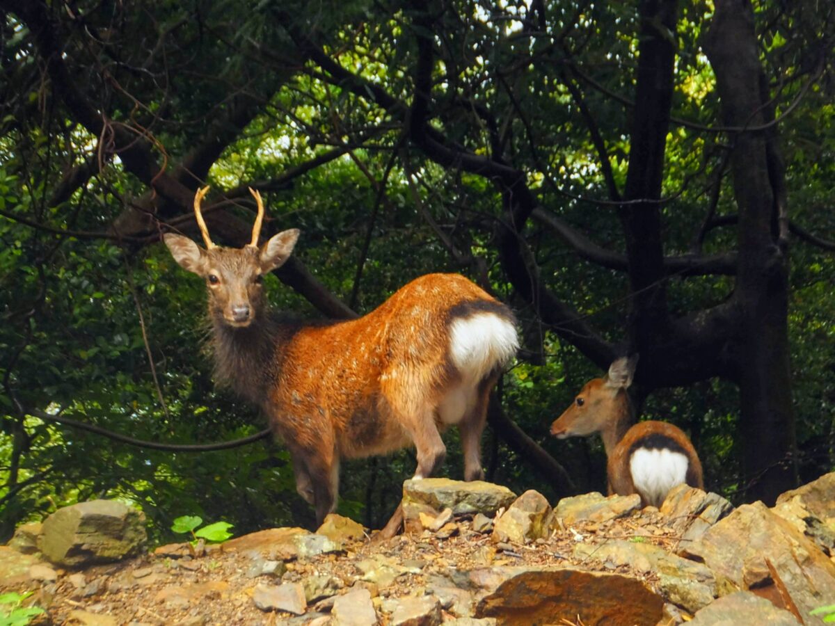 ヤクシカとニホンジカのお出迎え。左がヤクシカ。本土のシカに比べて小柄です。