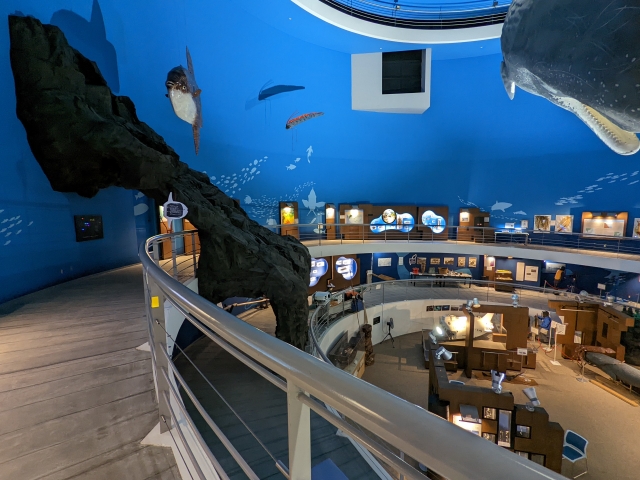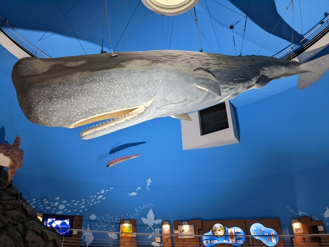 来館者を出迎えるのは、このミュージアムの目玉・マッコウクジラの実物大模型!大きなホールの中を泳ぐように吊るされた姿はただただ圧巻です。