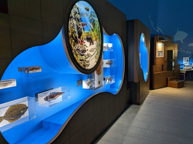 他にも、海の生物の映像コンテンツ、漁具や漁法、ホースでつながった昔の潜水服など、海に関わる様々な展示があります。じっくり見ていくと、いろいろと新しい発見に出会えます。