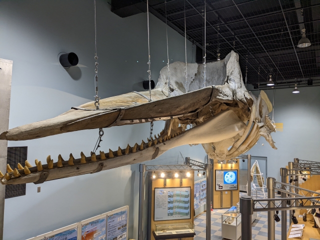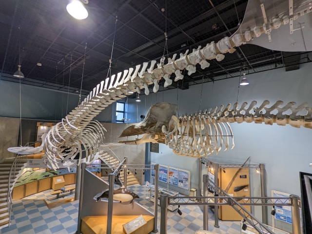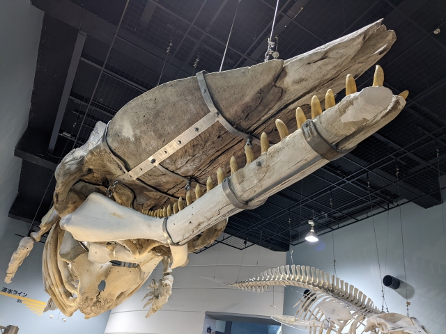 ホールの隣にある展示室では、マッコウクジラの骨格標本が天井からぶら下がっています。全長はなんと17.6mにも及びます。