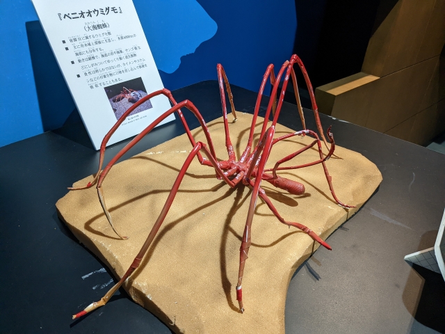 こちらの赤い物体は、ベニオオウミグモの模型。普通のウミグモが脚を広げて5cm程度なのに対して、この種は40cmクラスまで大きくなるというモンスター級のウミグモ。しかし、クジラを見た後だとなんだか小物感が否めないです。