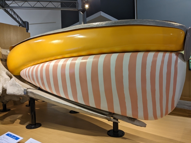 この頭骨には、マッコウクジラの潜水能力の秘密である脳油を貯蔵するタンク、そして脳油を作り出すジャンクという器官が詰まっています。あの大きな頭の中はこんな風になっていたのですね。
