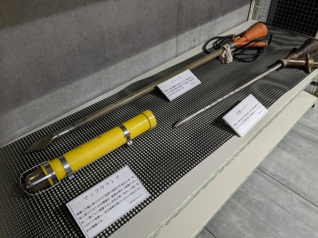 クジラに電流を流す「ジャンス」、捕獲したクジラに取り付けて目印にしたという「マッコウランプ」など、普段目にすることが無い道具がたくさん並んでいます。