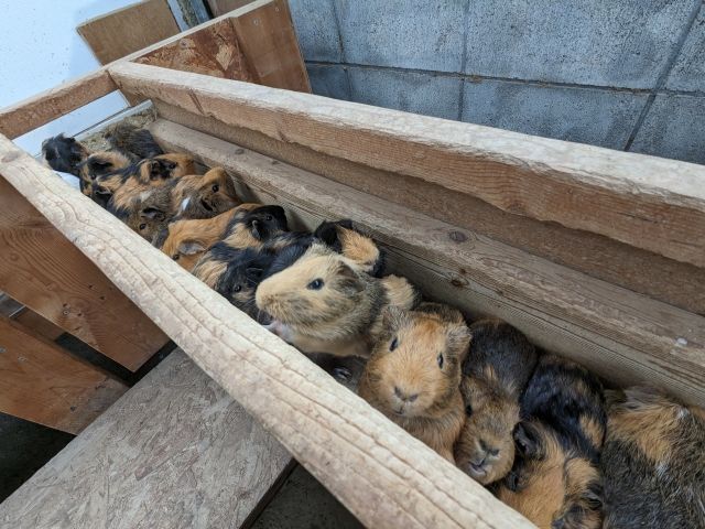 通路部分にびっしり並んだモルモットたち。ちょっと肌寒い日であったので、集まって暖まっているのかもしれません。なんだか押し寿司みたいな状況です。