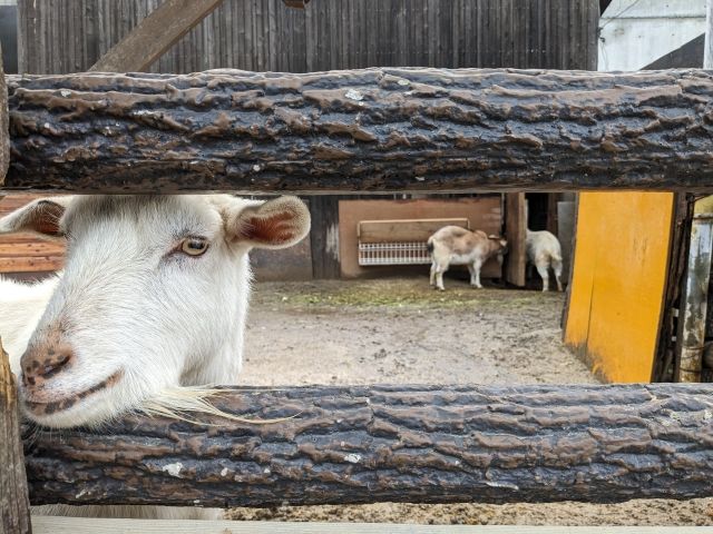 柵の隙間から顔を覗かせて、主張が激しいヤギ。すぐそばにエサのニンジンが100円で販売しています。