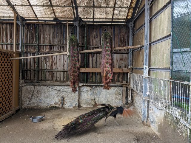 立派な尾羽を垂らしたクジャク。赤みを帯びた羽が渋くカッコイイです。