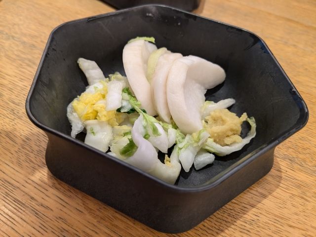注文すると、すぐにやってきたのはお漬物。こちらはなんとサービス品!以前はお代わりもフリーでしたが、いまはお一人一皿となっています。