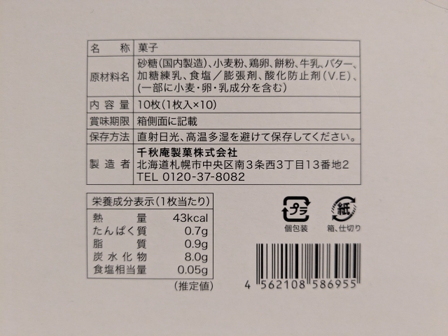 箱の裏側も説明無しですが、原材料を見ると少し内容の手がかりが。小麦粉、砂糖、鶏卵などお菓子らしいラインナップ。この原材料は使用した重量の割合が高い順に記載されていますので、小麦粉よりも砂糖が多く入っていることになりますね。