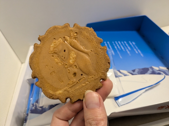 そして小袋をあけると、クッキーのようなお菓子が。これは、伊豆大島の牛乳煎餅のような甘い煎餅。パリッとした食感と、甘い風味が堪りません!
