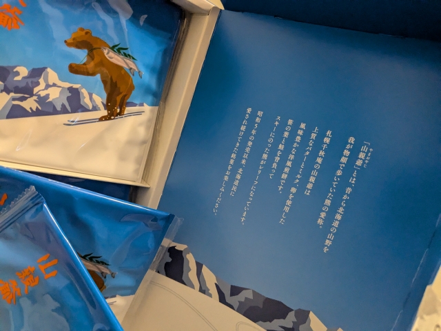 さらに「山親爺は上質なバターとミルク、卵を使用した風味豊かな洋風煎餅」との記載も。まさかの箱を開けるまで商品説明に出会えないのでした。
