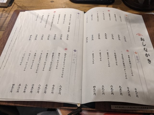 なんと、写真なしです!!お店の雰囲気がカジュアルでおしゃれな雰囲気だったのでちょっと意外ですが、シンプルな縦書きのお品書きは確かにうどん屋さんっぽいです。