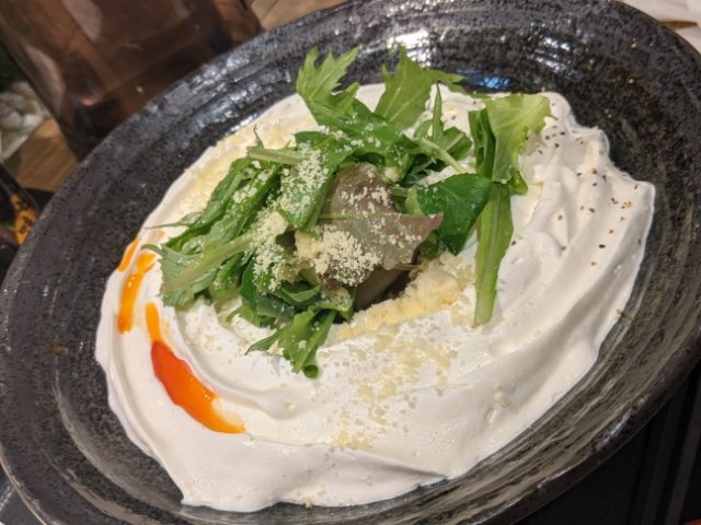 明太が白一色だったのに対して、ベビーリーフが乗っています。真っ白なクリームとのコントラストがあざやか。オレンジに輝くラー油も良いアクセントです。