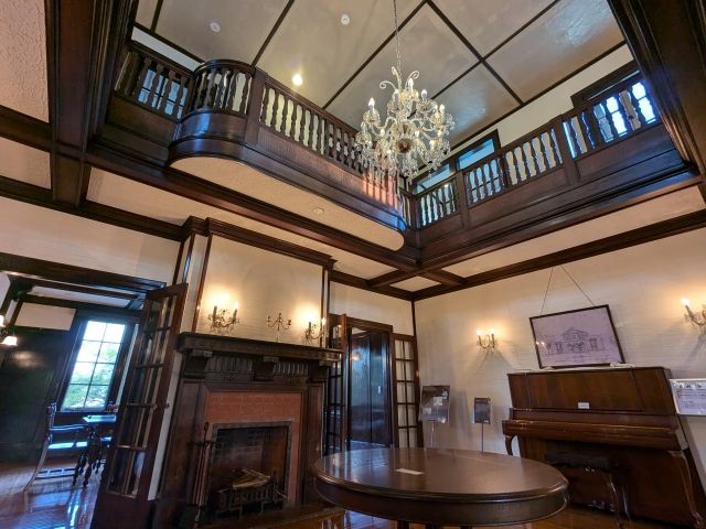 来館者を出迎えるのは吹き抜けのホール。煌めくシャンデリア、壁につけられた燭台、石膏プラスター引摺り仕上げの壁、美しく組まれた床板など細部まで意匠を凝らした装飾が施されています。