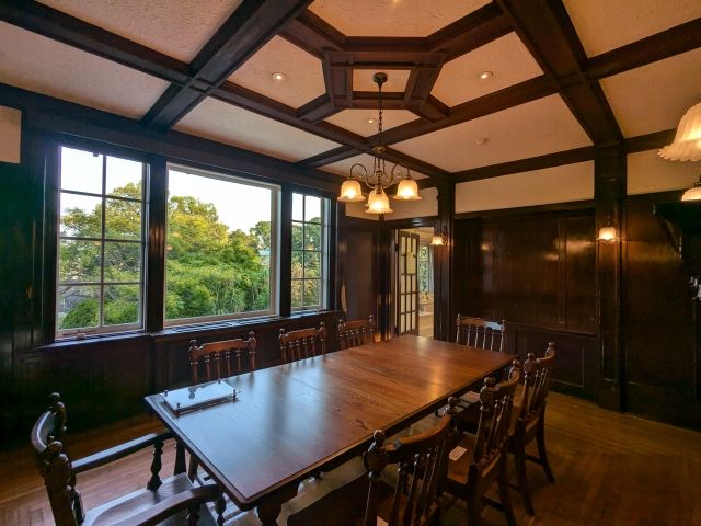 ホールと隣接している食堂。暖房として装飾された暖炉があり、先ほどのホールと背中合わせになっています。窓からは手入れされた美しい庭園の眺めが広がり、開放的な気持ちになれる部屋です。復元にあたり、家具は「横浜家具」が新たに制作されたそうです。