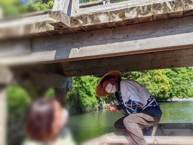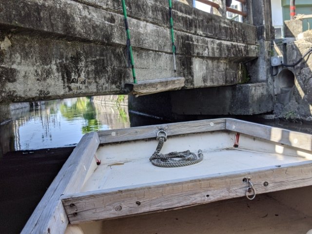 頭すれすれどころか、舟自体がぎりぎりなので、完全に寝そべらないと頭をぶつけてしまいます。私が乗船したときは人数が少なかったため船頭さんも一緒にかがんで通り抜けましたが、乗船人数が多いときは、なんと「舟から橋に飛び移り、通り抜けてきた舟にまた飛び乗る」というアクロバティックな動きが見れることもあるそう。