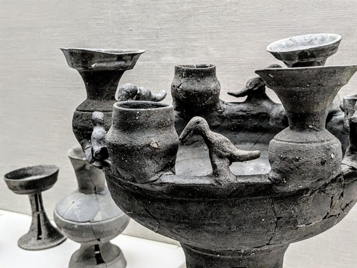 大石古墳出土の須恵器も、装飾付子持器台。上部の生き物は鳥に見えますが、羽の表現がないのが不思議なポイント。もし鳥じゃなかったなら、いったい何を描いたのか。ロマンが広がります。