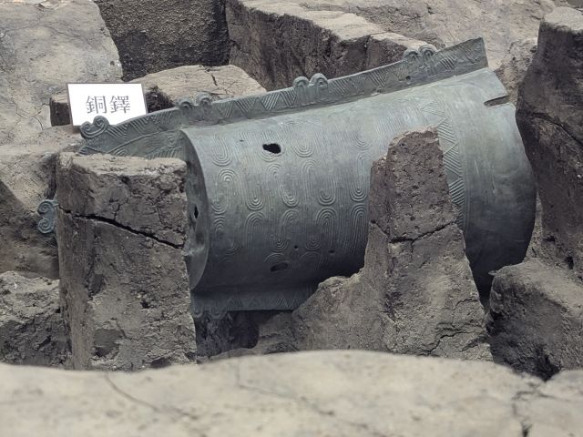 来館者を最初に出迎えるのは、跡部遺跡より出土した銅鐸。水が流れるような紋が描かれていることから、流水紋銅鐸と呼ばれています。丁寧に埋葬されており、その埋納遺構もあわせて市の文化財に指定されています。