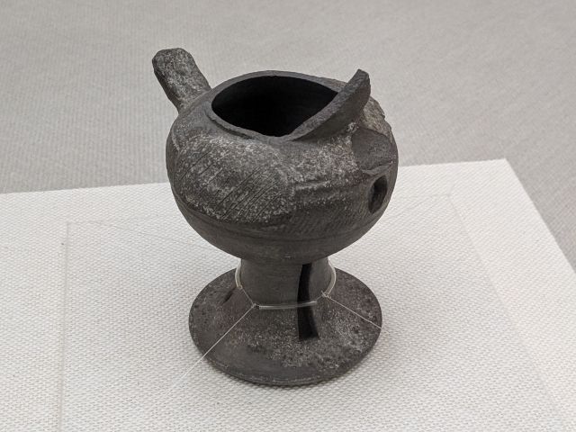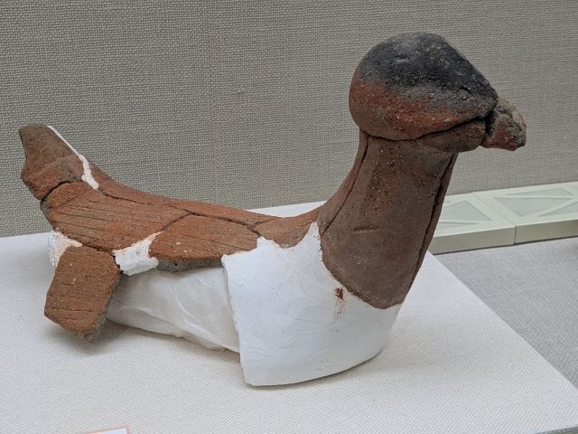 こちらは台付鳥形はそう。「はそう」というのは水や酒を注ぐための器で、鳥のかたちをした須恵器です。残念ながら首は落ちてしまっていますが、羽や尾羽が鳥であったことを物語ります。(※「はそう」は本当は漢字なのですが、コピペしても記事内で非表示になっちゃうため平仮名にしてます。)