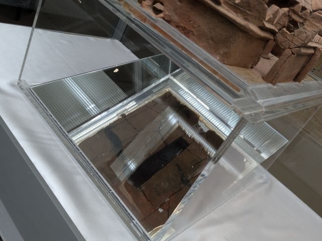 埴輪の下部にはその名の通り導水施設が作られています。通常は見えませんが、鏡で下からも見えるように工夫されています。このように家や囲み塀、導水施設まで一体化している埴輪はとってもレア。全国唯一との噂も。