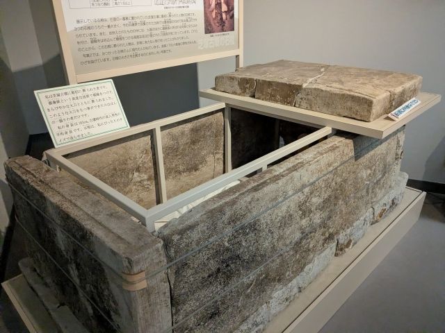 芝塚古墳の石棺も展示されています。3つの石棺が見つかっていますが、その中で最も大きいもの。当時は最高級と考えられる兵庫県産の竜山石で、さらに高度な技法で装飾された刀装具も出土。かなりの権力を持った人物が埋葬されていたと考えられています。