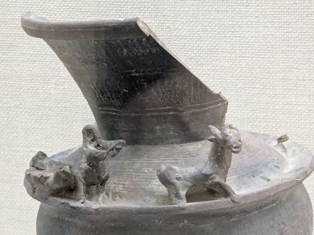 恩智遺跡出土と伝わる須恵器は、上部にユニークな造形が。ツノがはえたまるで麒麟みたいな生き物ですが、鹿と狩人と考えられています。後ろの人物は弓を持っているようにも見え、さらに人の後ろには船のようなものも。なんかドラマがありますね!