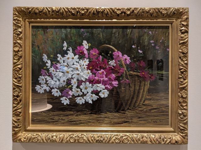 そんな三栖右嗣とヤオコーの繋がりとなったのが、こちらの《コスモス》。白とピンクのコスモスは、花びらに濃淡が表現されているため、立体感のある作品です。