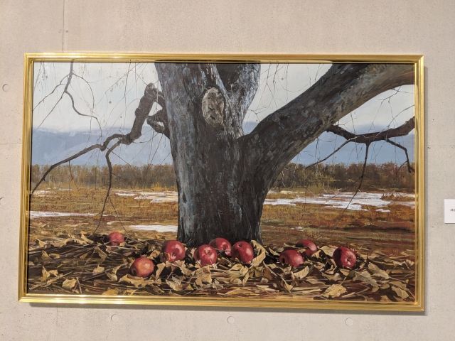 《林檎のある風景》は、太い木の根元に落ちる赤いリンゴを描いています。落ち葉の布団の上に並ぶリンゴは、ツヤツヤの質感がリアル。とっても美味しそうです。