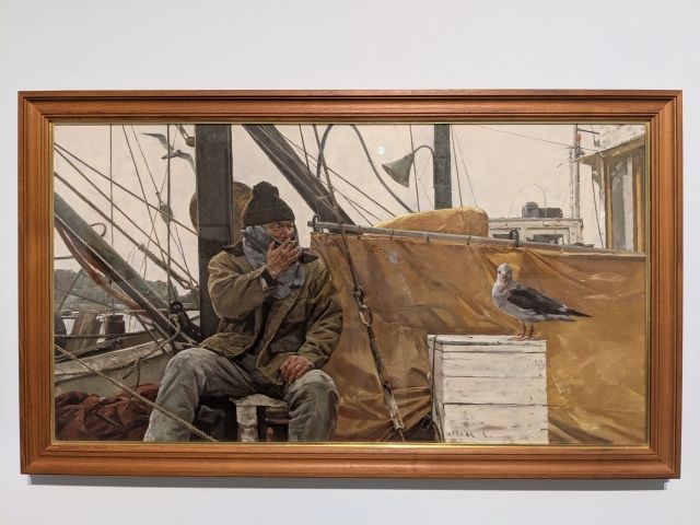 《かもめとキッツォ爺さん》は、たばこを加える漁師風のおじいさんと、そのそばに留まるカモメを描いた作品。おじいさんがカモメに話しかけているように見える、ほのぼのした風景です。この人物は千葉の漁師であり、「キッツォ」は「吉宗(きっそう)」という名から来ているそうです。