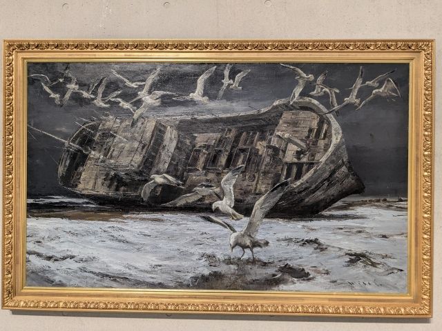 横たわる巨大な廃船と、飛び交うカモメの姿で迫力のある《オホーツク》。この船はなぜ横たわっているのか、いつからこうしているのか、何のための船だったのか、遠くに見える小屋は漁師小屋なのか。想像力が掻き立てられる絵画です。