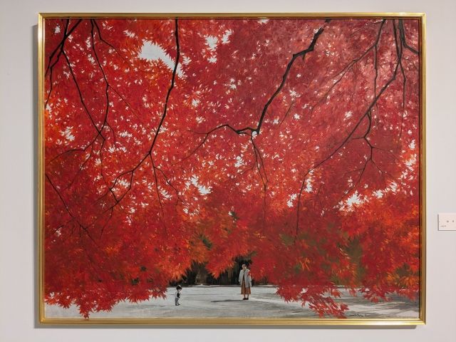 《秋日》は、キャンバスのほとんどを紅葉が埋め尽くす大胆な作品。紅葉の下には2人の人物が描かれます。人物は最小限の書き込みでぼんやりとしているのに、祖母と孫であることがわかるのが不思議です。