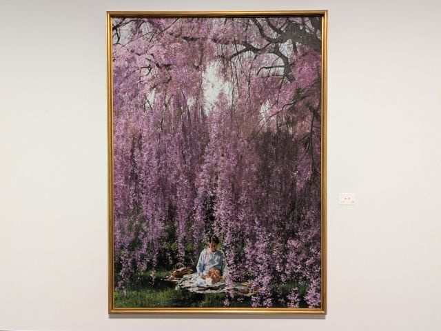 高さ2m以上ある大きな《爛熳》。キャンバスを埋め尽くすのは鮮やかなシダレザクラ。その下にはレジャーシートに座る母親と赤ちゃん。リアルな人物のはずが、逆に幻想を感じます。