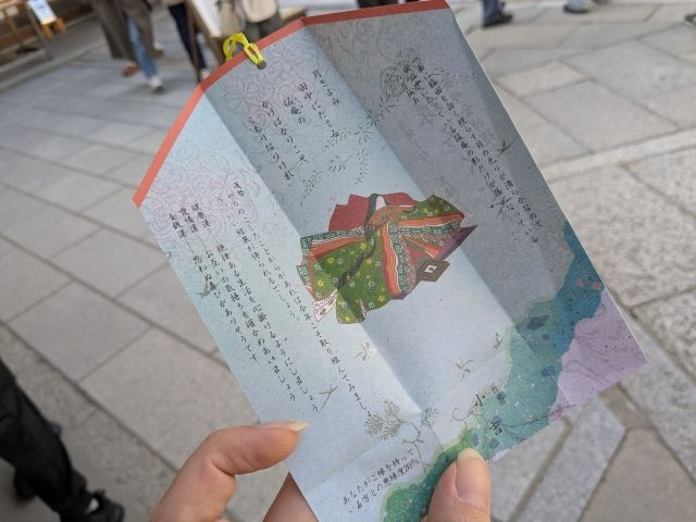 筒を振って出てきた番号を社務所に伝え、いただいたのがこちらのおみくじ。なんだか豪華な仕上がりです。