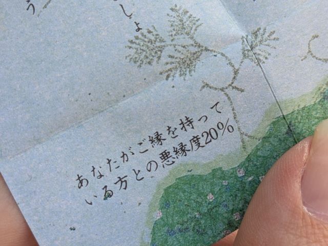 気になるのはおみくじの左下、『あなたがご縁を持っている方との悪縁度20%』という記載。おみくじで数値が出てくるってとても新鮮ですね!