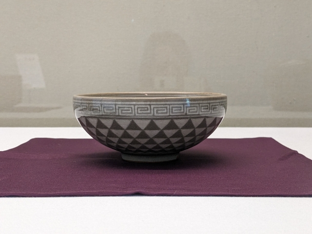 一番の特徴は、独特の象嵌(ぞうがん)文様。粘土がまだ柔らかいうちにヘラ等で文様を刻み、できた凹面に素地と色の違う土を埋め込むことによって仕上げられています。こちらの《象嵌鱗文茶碗》は、寸分のズレもなく描かれたウロコ模様が見事な作品。