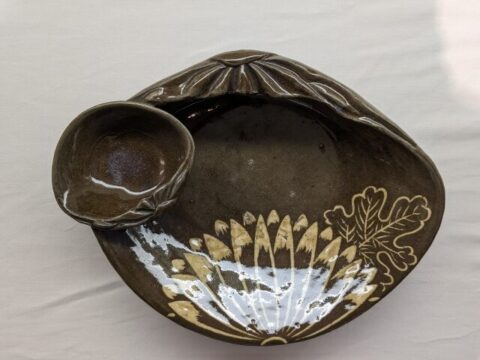 《象嵌菊花文蛤形鉢》のような個性的なデザインの器も。大きなハマグリに小さなハマグリがのった鉢はとてもユニーク。菊の花の象嵌模様もしっかりと描かれています。