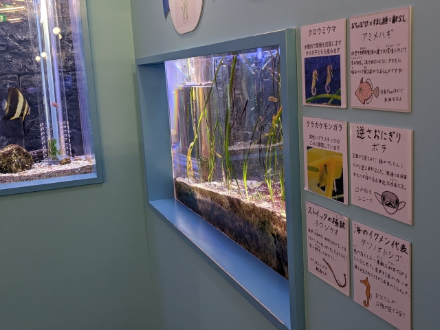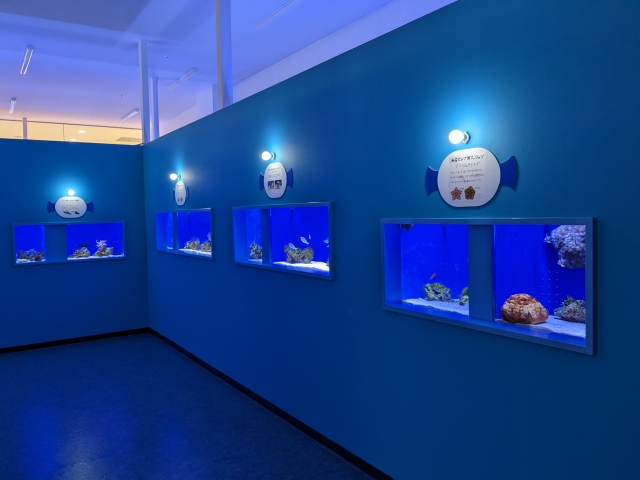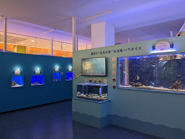 館内は幼魚が飼育された小さな水槽がたっぷり。「擬態の天才」「危険な幼魚」など、様々なテーマごとに集められています。