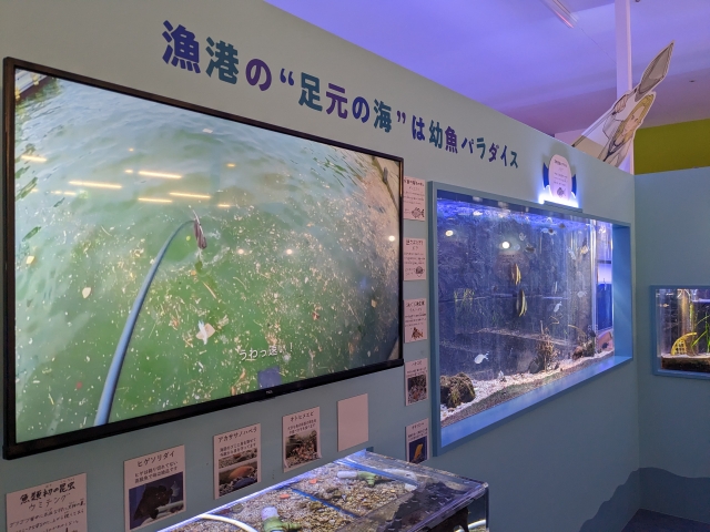 館内に進むと、モニターで香里武さんの採集風景が流れています。長い網を片手に次々と幼魚を捕獲する映像は、なんだかとってもかっこいい。この映像、ずっと見てられます。
