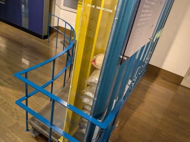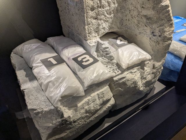 税関の重要な仕事が、密輸品の取締。ここでは、その巧妙な手口が再現された展示がされています。こちらの白い粉は、2014年に発生したメキシコから到着した石材に隠されていた事件を再現しているそう。