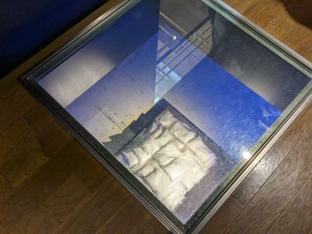 展示室の一角は「白い粉と黒い武器」という、物騒な香りがぷんぷん漂うエリア。床に空いた窓には白い粉やMD◯A、◯麻、拳◯がずらり。いずれも模型ですが、かなり精巧に再現されています。