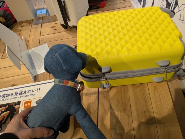 麻薬探知犬のぬいぐるみもあります。こちらも上手く不正品を探知するとブルブル震えます。
