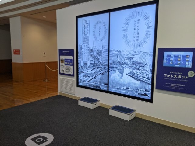 様々な背景を選べるデジタルフォトスポットもあります。横浜の美しい写真をはじめ、「横浜みなと博物館こんなに楽しいなんて!」という漫画風な背景も選択可能。ここに立つと、みなと博物館への再訪を誓わされます・・・!どういうことかは、現地に行ってのお楽しみということで。