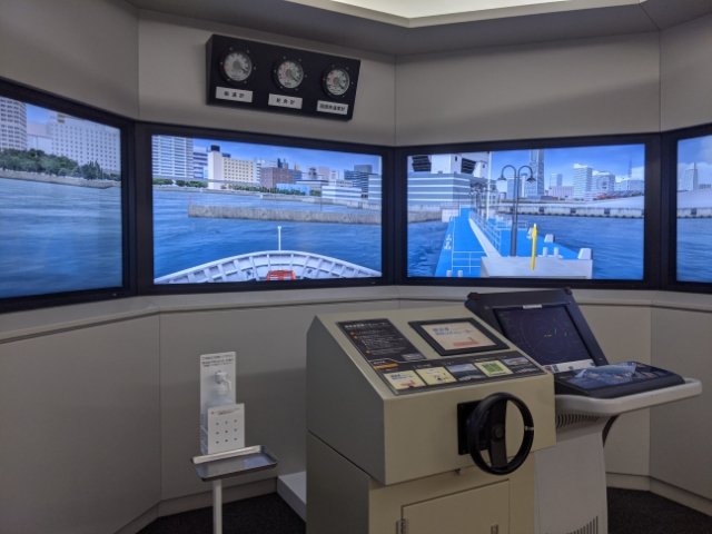 横浜港操船シミュレーターもあります。ゴールの大さん橋に向かって船を動かすのですが、これがなかなか難しい!!かなり早めに舵を切らないと曲がり切れなかったり、切り過ぎても思わぬ方向へ行ってしまったりと難易度は高め。難しい分、無事ゴールできたときの喜びは大きいです。