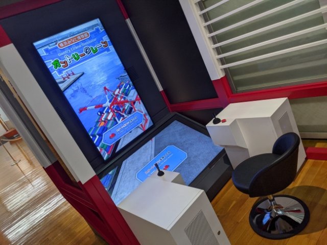 こちらはガントリークレーンシミュレーター。港に立ち並ぶキリンさんみたいな大きなクレーンを操作することができる機械。左右のレバーでクレーンを動かして制限時間内にコンテナを動かします。
