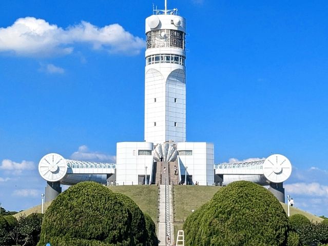 横浜の市街地から離れた埠頭にそびえ立つ白亜のタワー。周辺は芝生広場の公園になっており、横浜港を行き交う様々な船を眺めることができます。のんびり過ごすのにぴったりなスポットです。