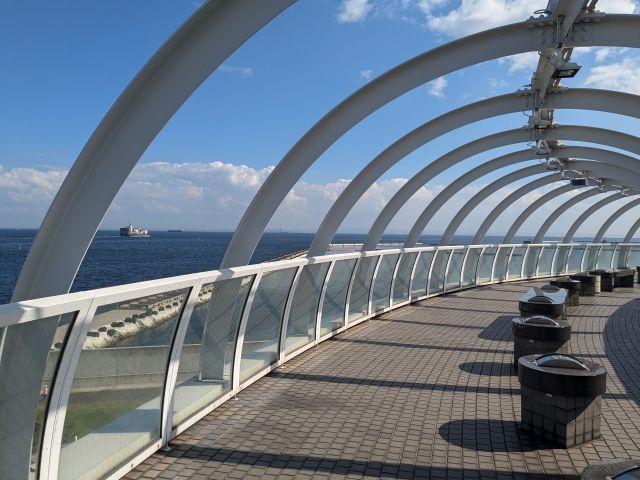 地上高は12.5m。目の前に広がる海では多数の船舶が行き交います。停船していたり、港から出ていったりと様々な仕事をこなす船たちの姿は、時間を忘れてずっと見ていられる光景。