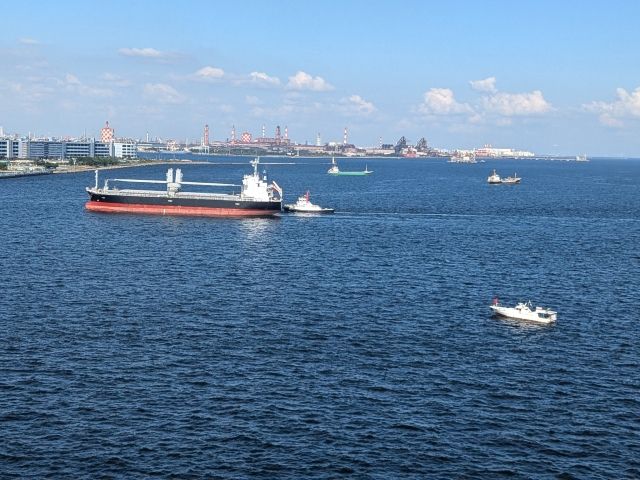 沖で停泊している大型船は、信号が変わるのを待っているのかな?いろいろ考えながら見てみると、先ほどの船舶の様子がまた違って見えてきますね。