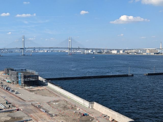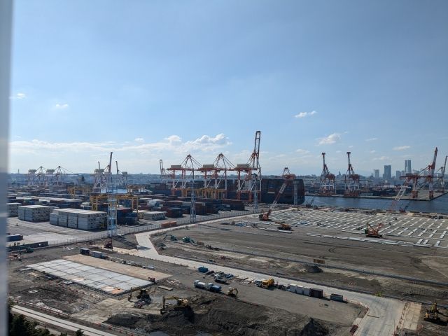 窓の向こうにずらりとならぶのは、キリンさんのような姿のガントリークレーン。奥にはマリンタワー、ランドマークタワーも見えます。