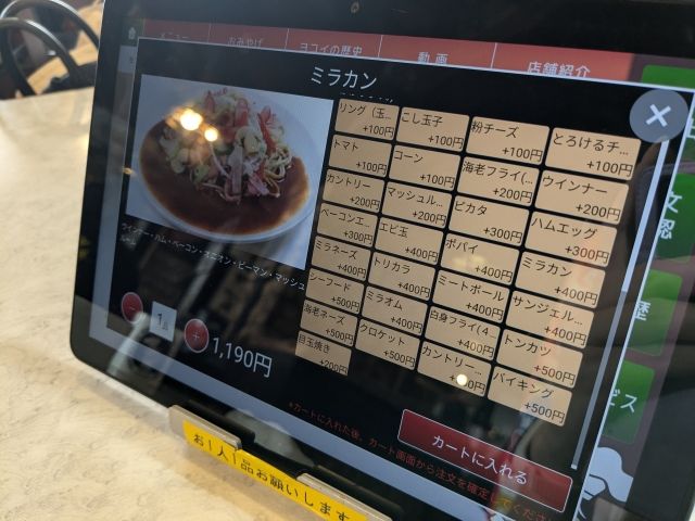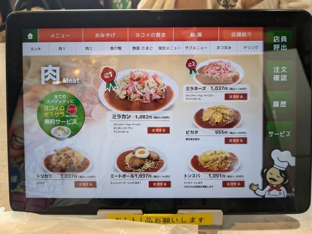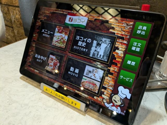 注文はこちらのタッチパネルにて。メニューはもちろん、ヨコイの歴史紹介やプロモーションビデオも入ってます。注文後、料理提供までに見ていると、気持ちが高まります!