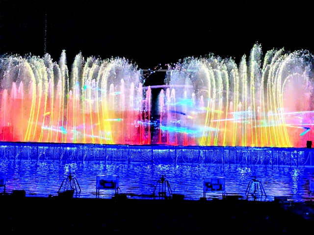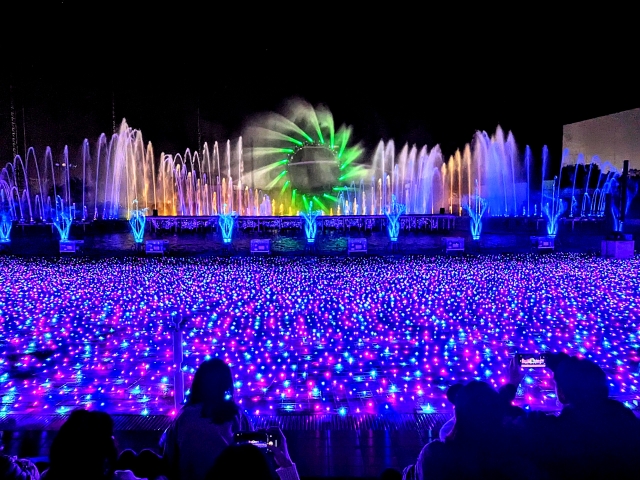 185本の噴水を中心に、レーザーやイルミネーションが連動して動く大迫力の演出。中心の巨大リングは水を噴出しながら回転、さらに中心がウォータースクリーンとなっており、プログラムに合わせた様々な映像が映し出されます。