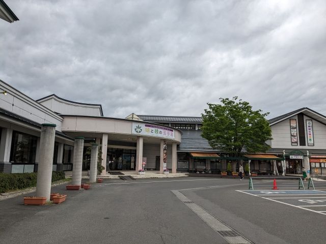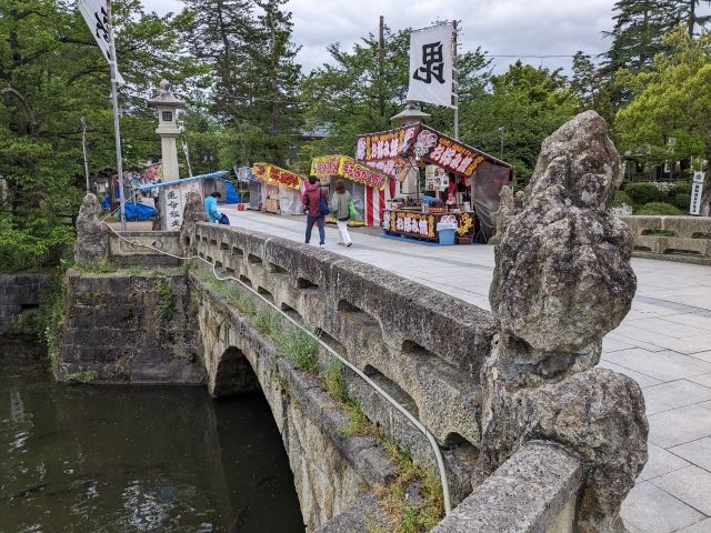 今回は車での訪問なので、松が岬おまつり広場 駐車場からスタート。駐車場には特産品販売店や米沢牛レストラン、米沢牛コロッケ、玉こんにゃくなどの軽食販売もあってにぎやかな雰囲気ですが、まだ朝早いため人は少な目。
